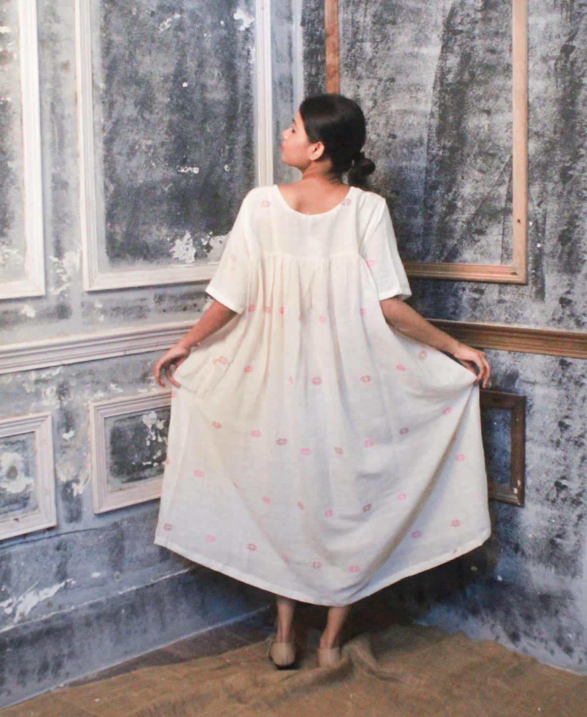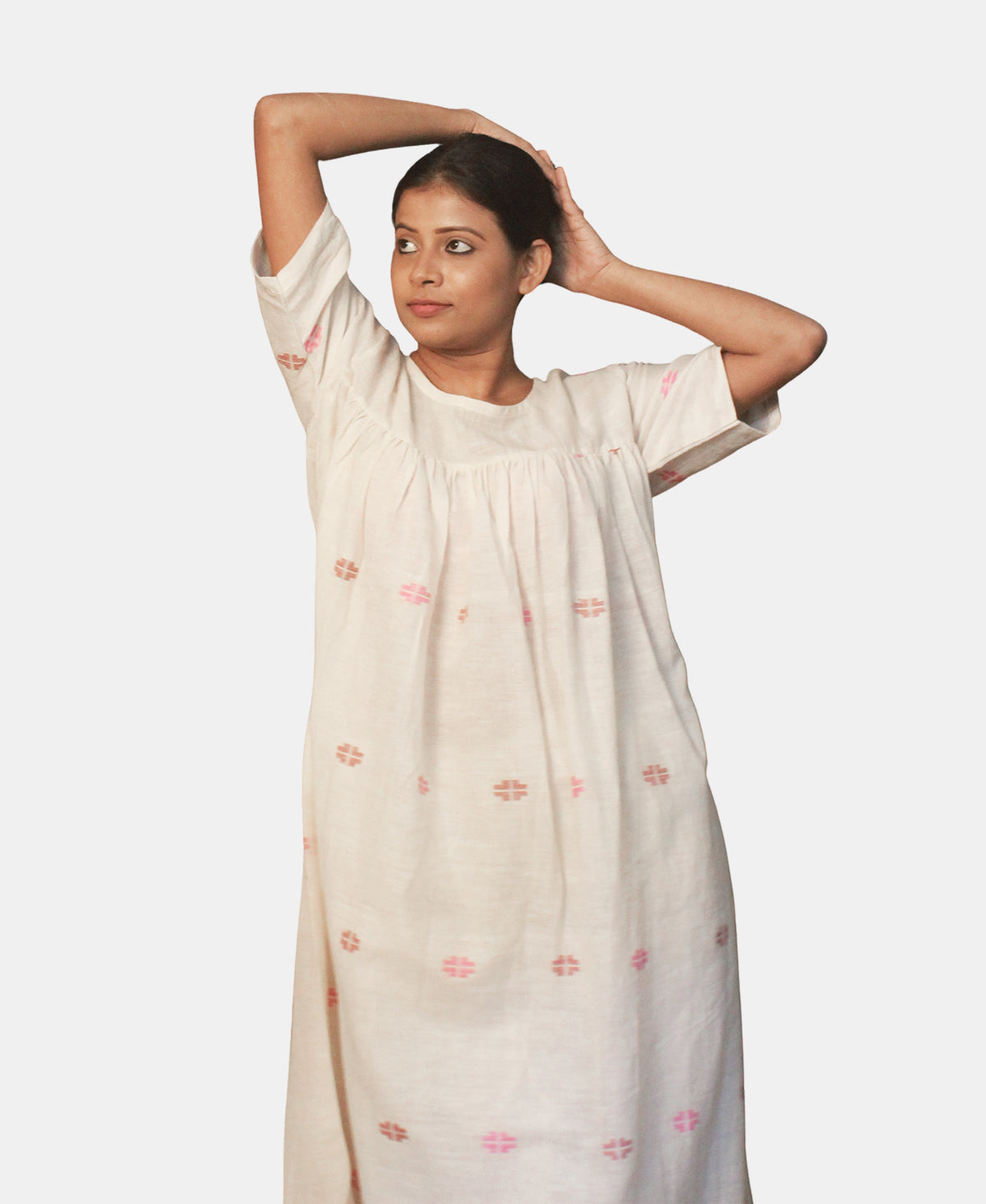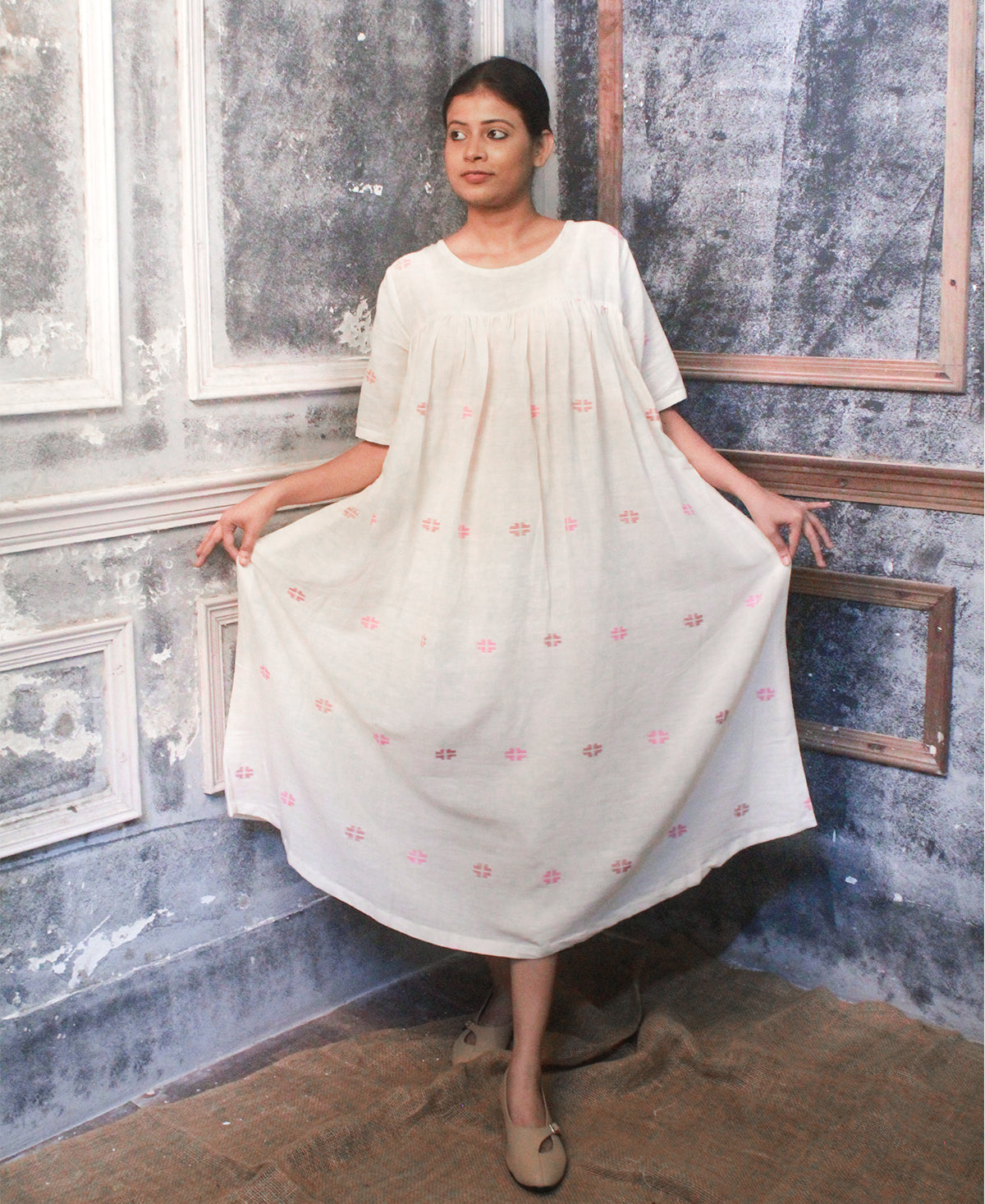 This peasant Jamdani dress is made from breathable handwoven cotton, featuring delicate pink floral Jamdani buta intricately woven on a soothing ivory base. The floral motifs, subtle yet striking, are a nod to heritage craftsmanship, blending classic Bengali weaving techniques with contemporary comfort. Each buta is placed with care, telling its own tale of artistry and effort.