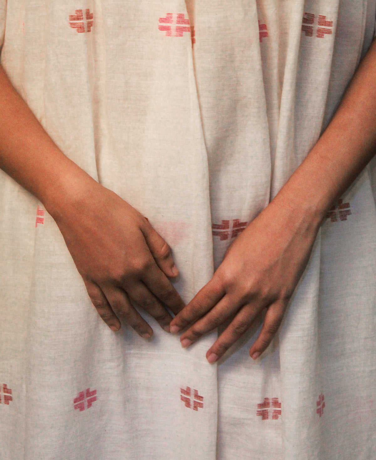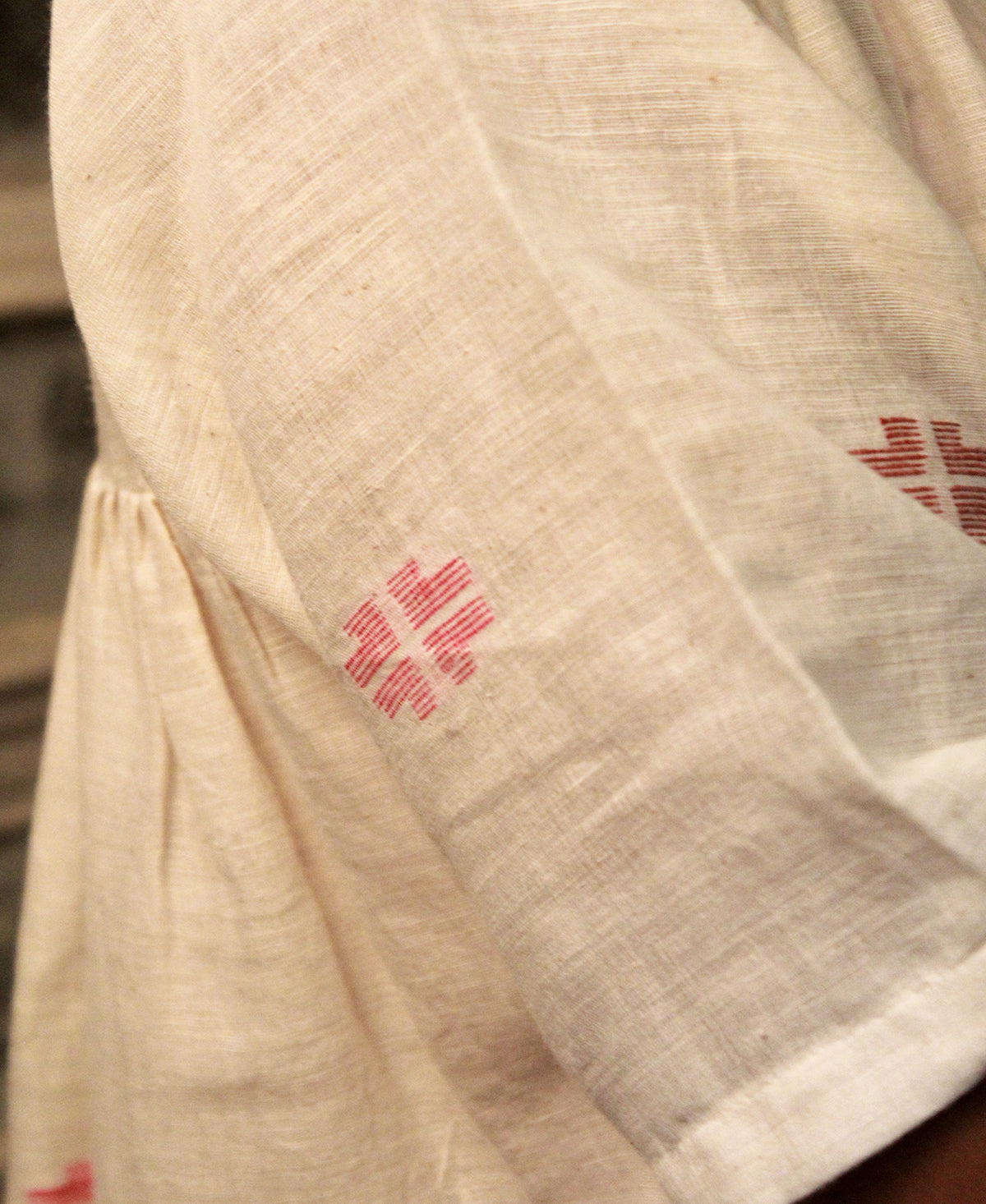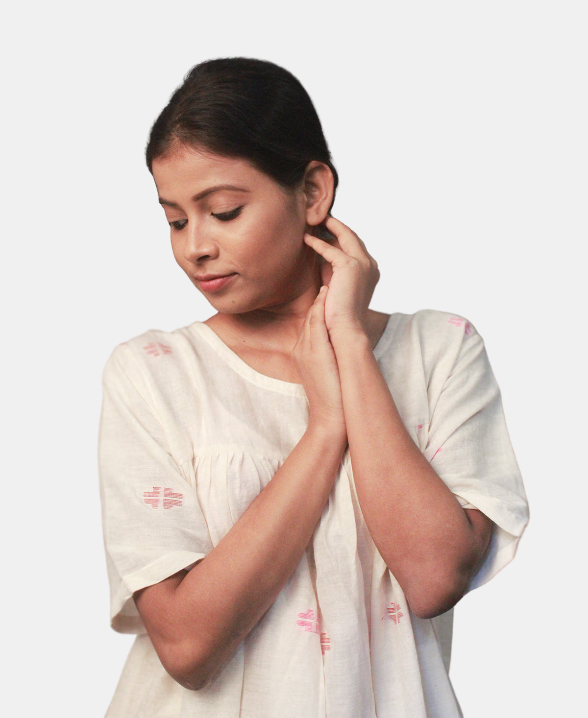 This peasant Jamdani dress is made from breathable handwoven cotton, featuring delicate pink floral Jamdani buta intricately woven on a soothing ivory base. The floral motifs, subtle yet striking, are a nod to heritage craftsmanship, blending classic Bengali weaving techniques with contemporary comfort. Each buta is placed with care, telling its own tale of artistry and effort.