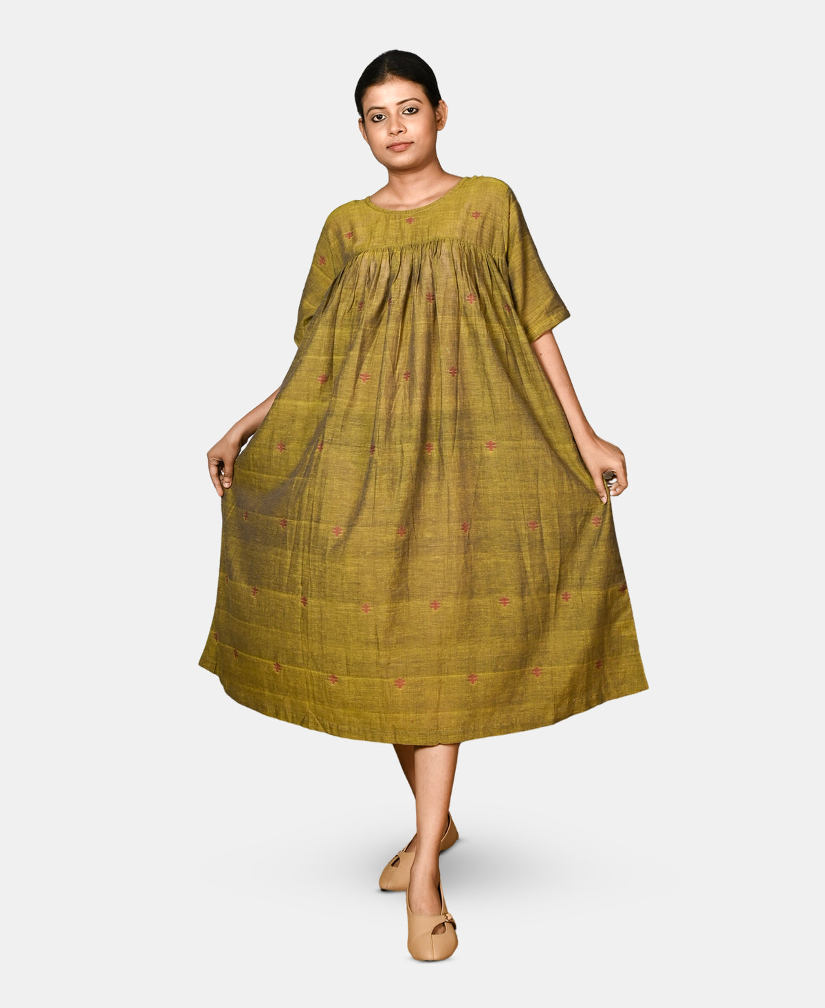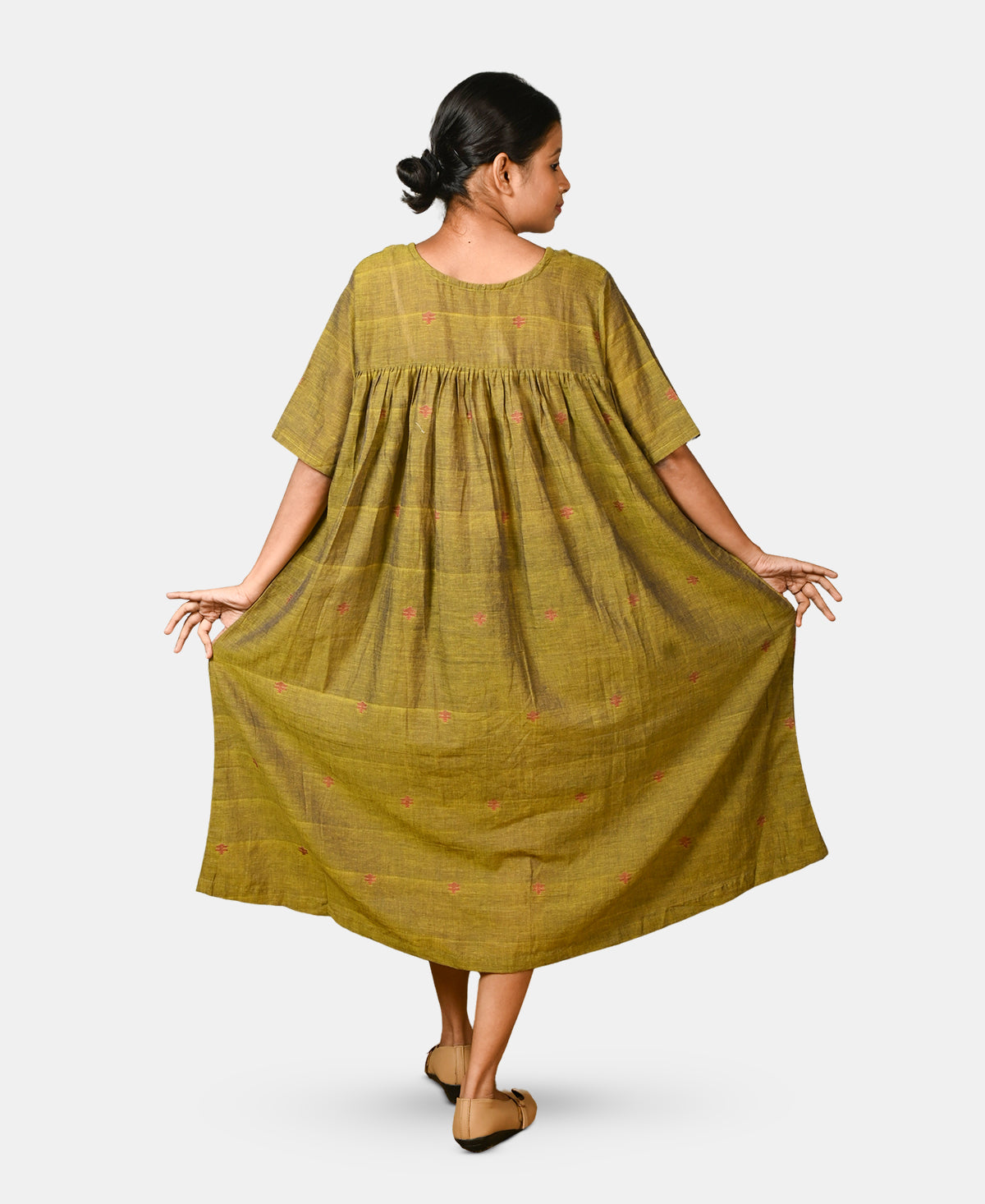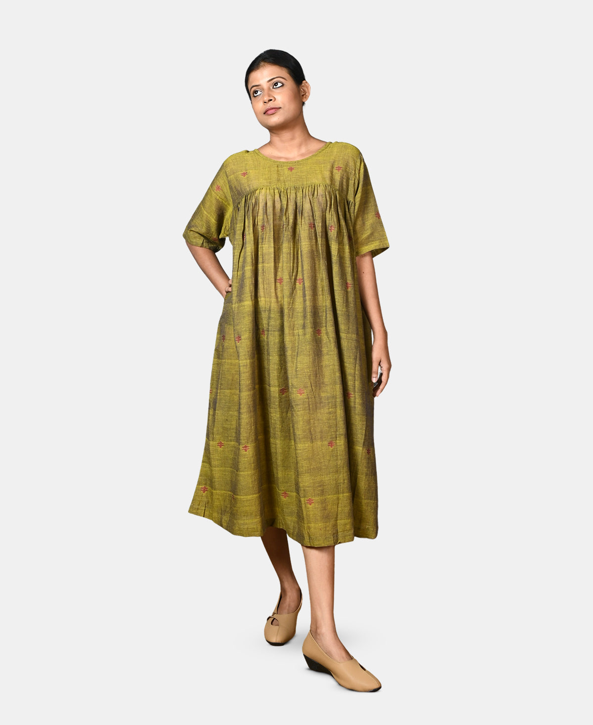 Crafted from premium 100-count handloom cotton fabric, this gathered peasant dress showcases the timeless beauty of handwoven textiles. The relaxed silhouette flows gracefully from the gathered yoke to the calf-length hem, while the comfortable round neckline and elbow-length sleeves offer effortless style perfect for any season.