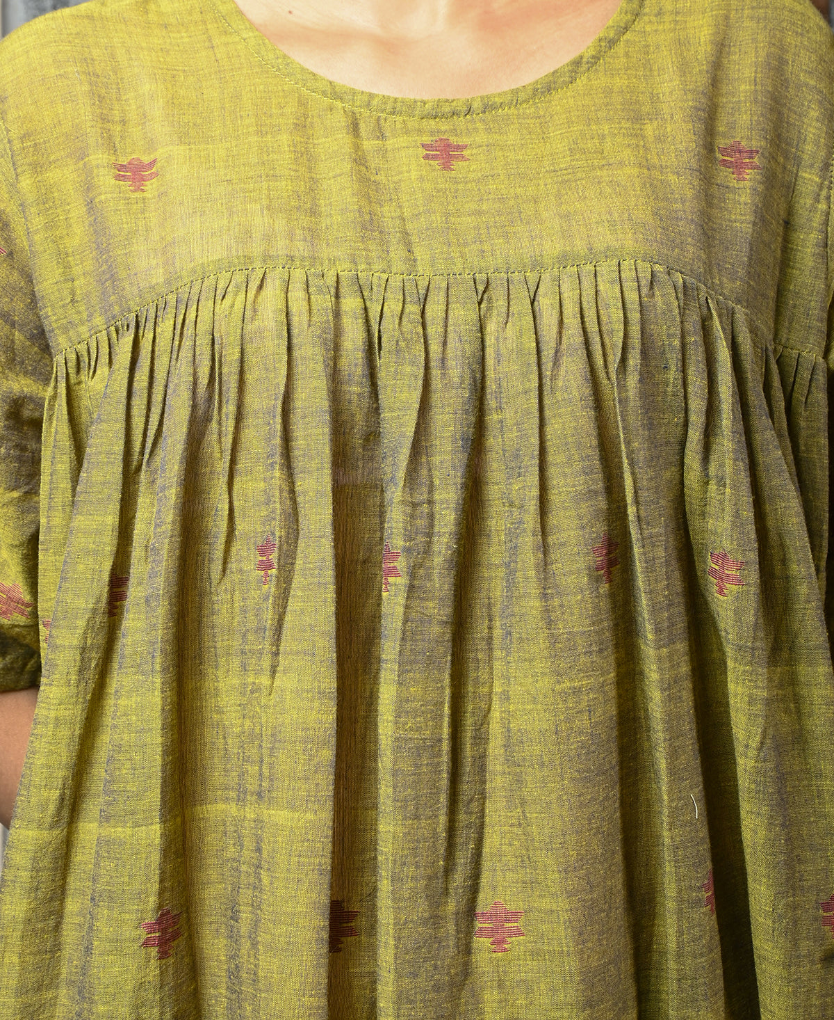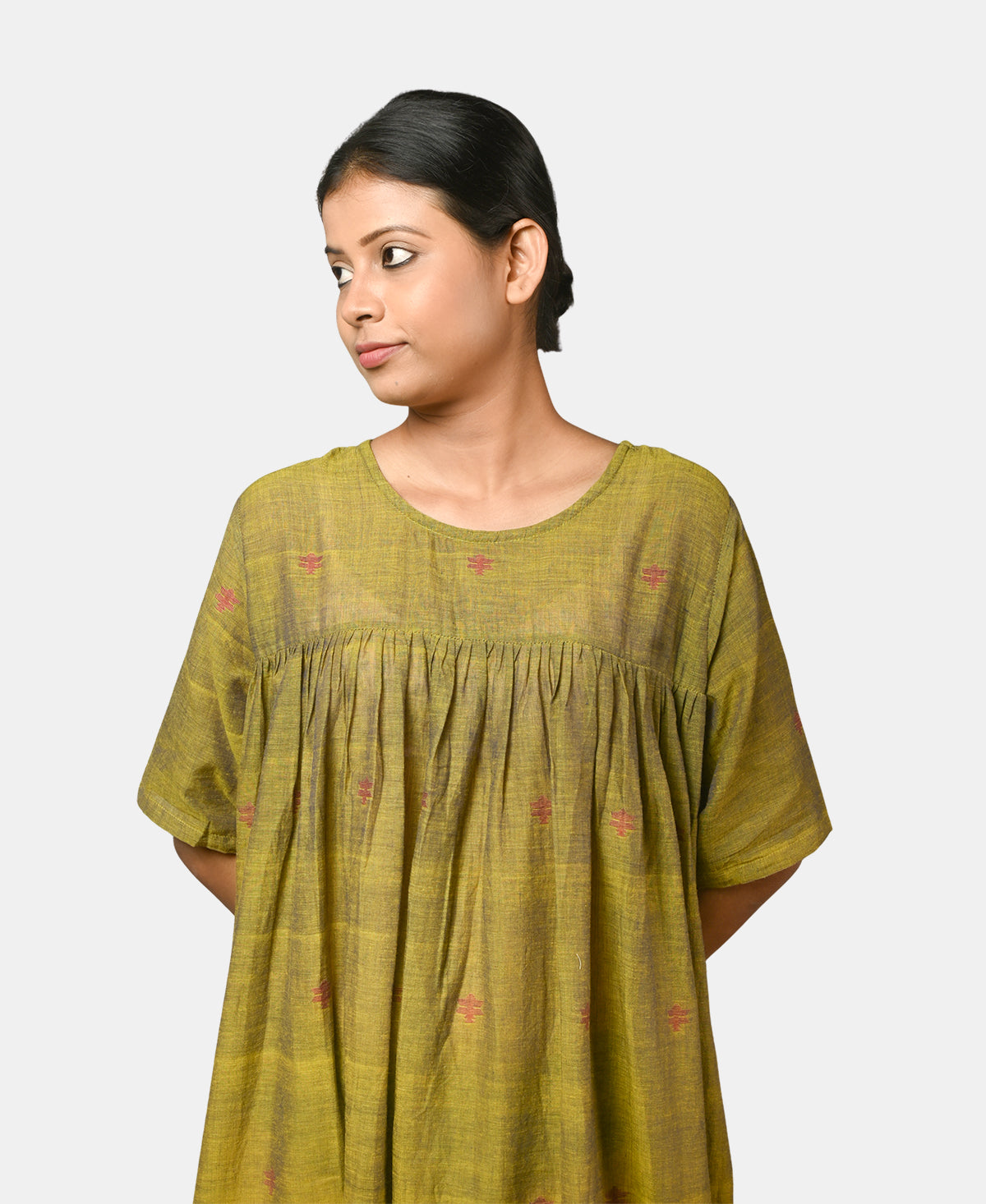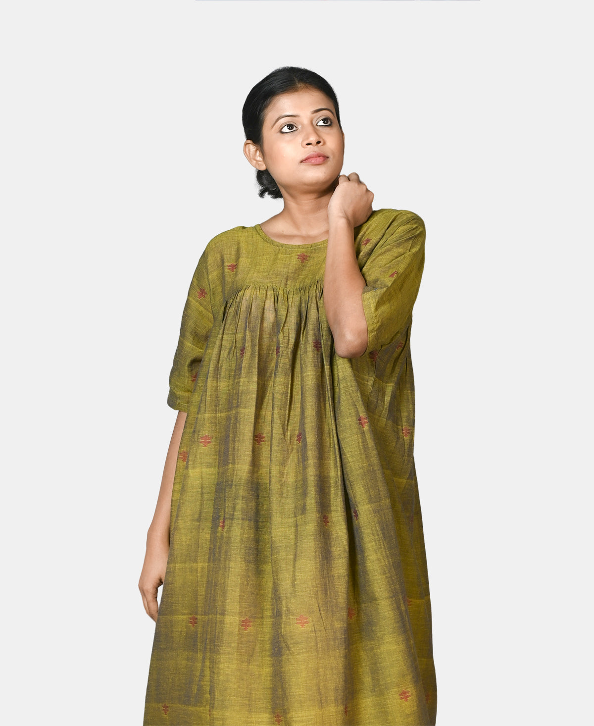 Embrace bohemian elegance with Bonolata, a deep moss green peasant dress that tells stories of countryside meadows and artisan heritage. This stunning piece features exquisite red jamdani buti motifs delicately woven across the rich green canvas, creating a tapestry of traditional craftsmanship that captivates with every glance.