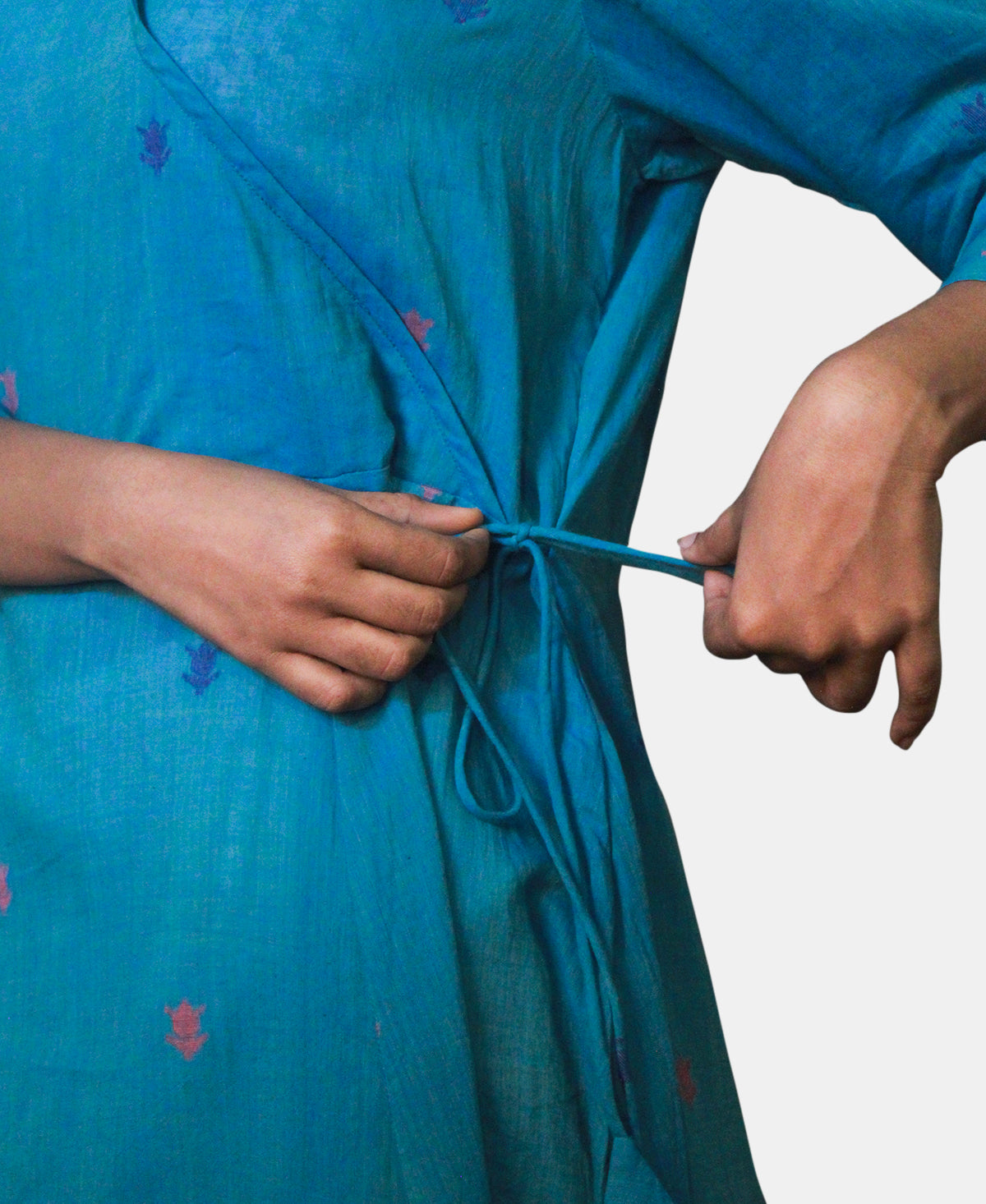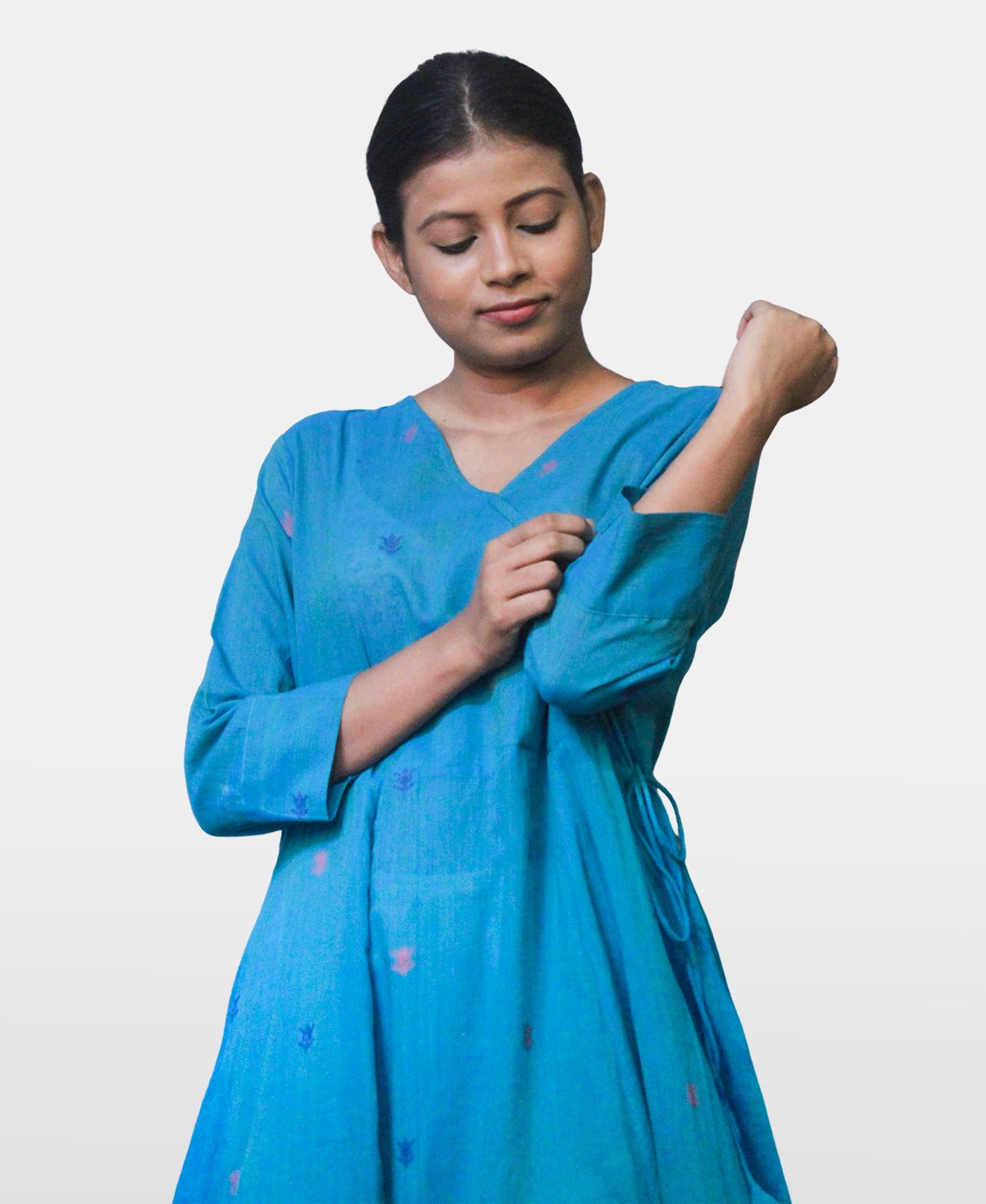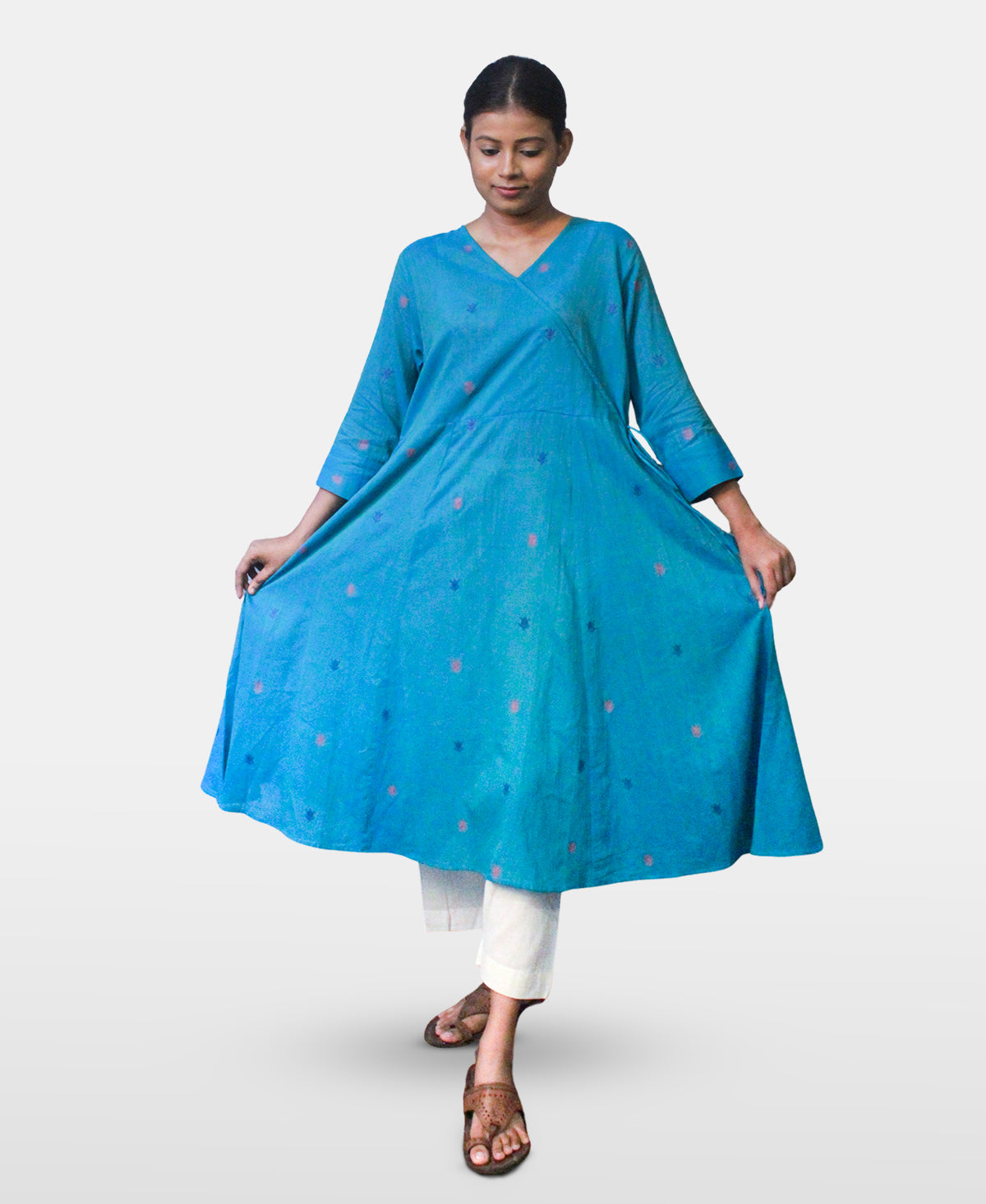Masterfully crafted from premium 100-count handspun cotton, this wrap-style Anarkali features the finest artisan weaving techniques passed down through generations. The flattering V-neckline and three-quarter sleeves complement the flowing A-line silhouette, while the knee-length hemline offers versatility for both casual and festive occasions.