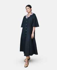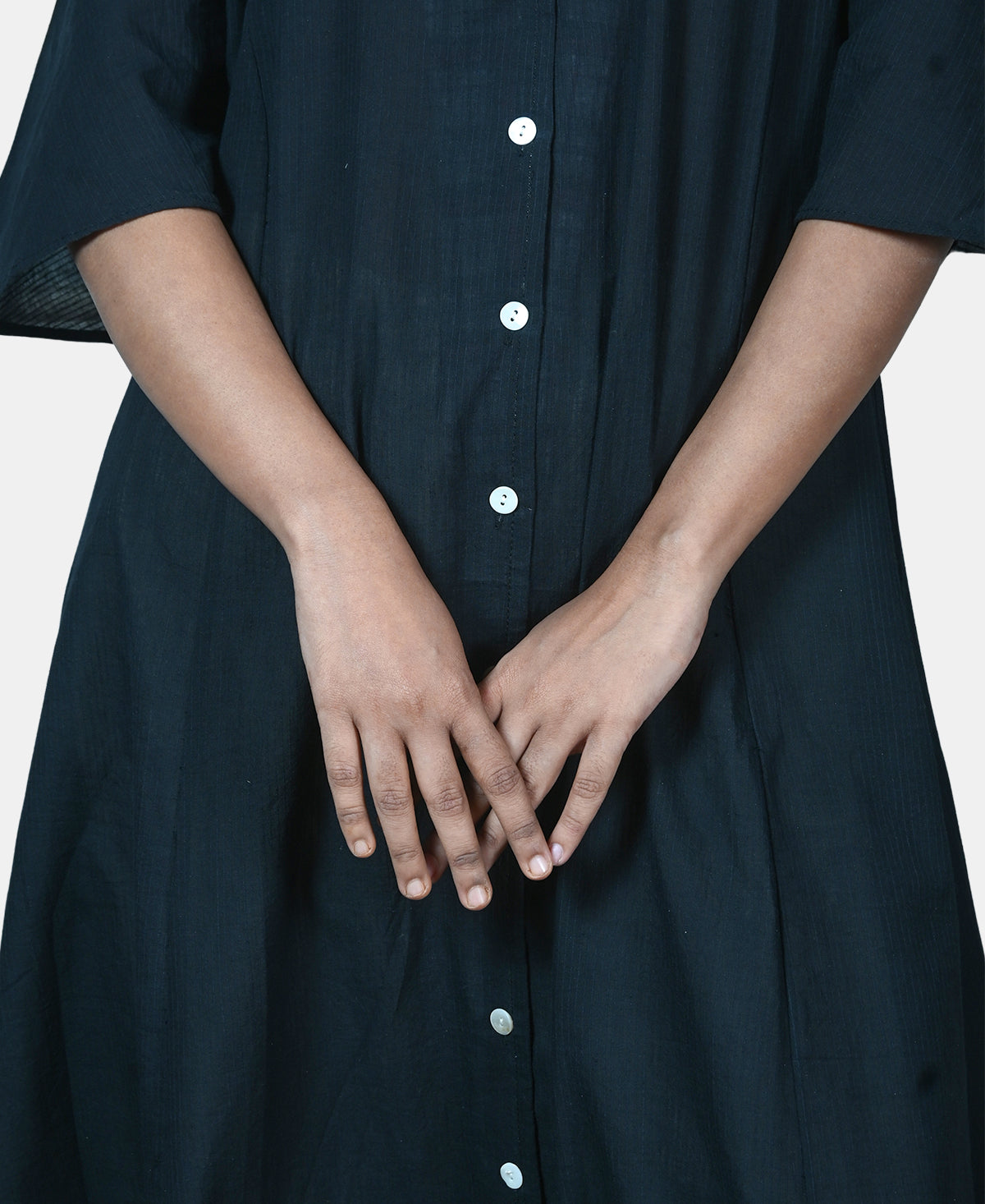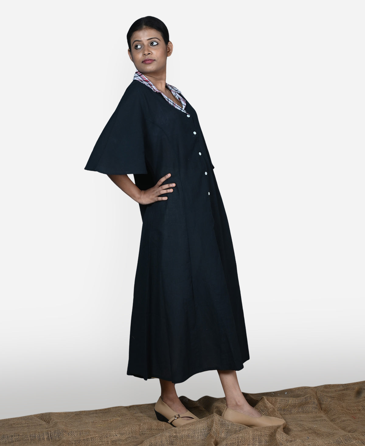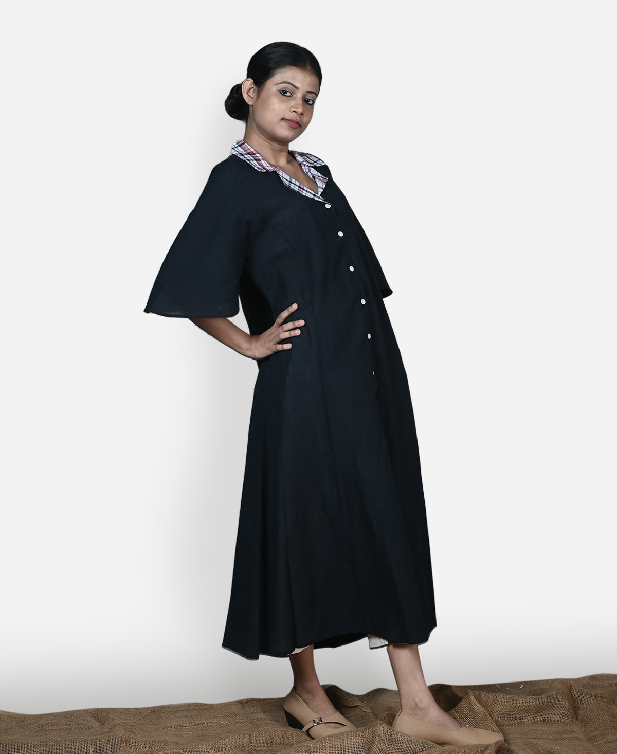 black cotton A-line dress with flats for a relaxed look, or add statement jewellery and heels for an elevated vibe. Designed as part of sustainable ethnic wear, it’s not just a dress; it’s a reflection of slow fashion and timeless craftsmanship.