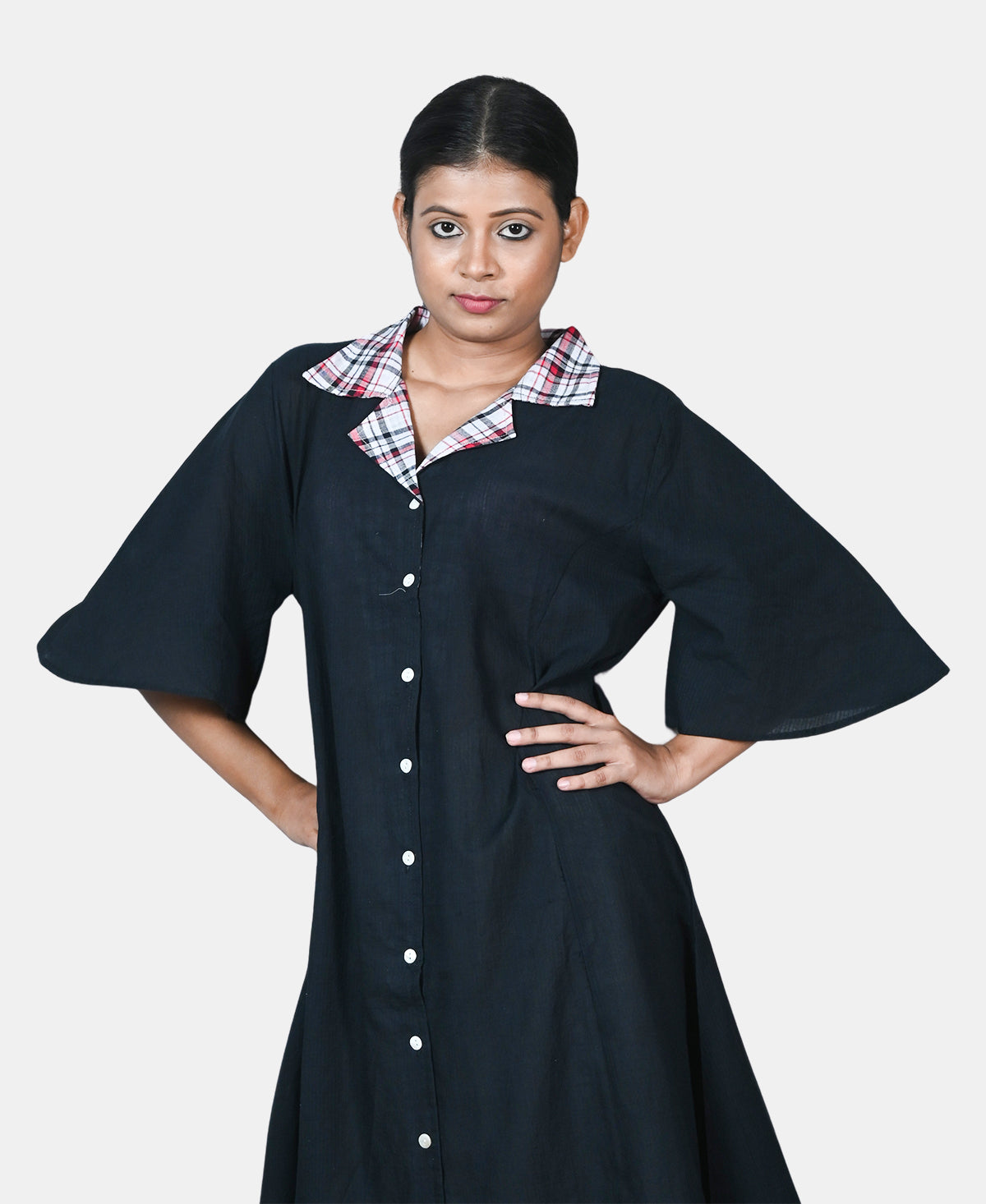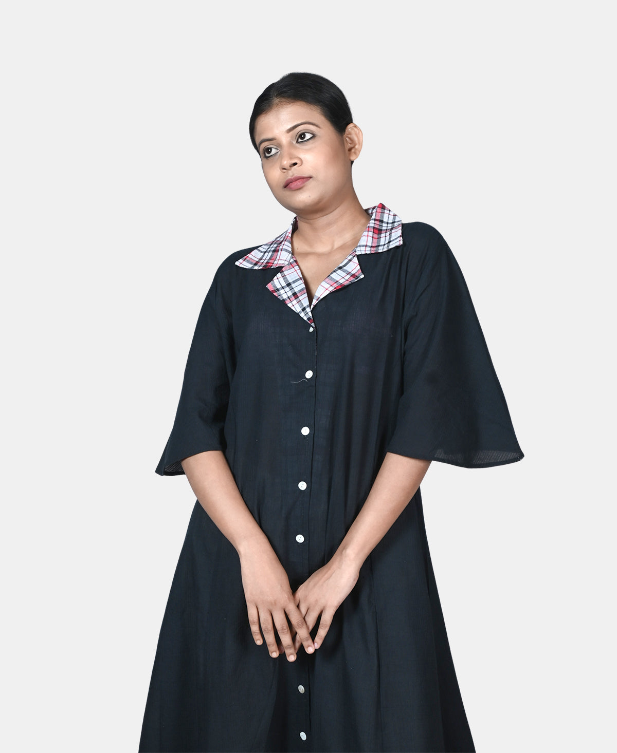 A-line silhouette flatters all body types, giving it a graceful movement with every step. Featuring a smart collared neckline with checkered detailing and a button-down front, this handspun cotton dress perfectly blends modern minimalism with artisanal charm. Whether you’re dressing up for a casual outing, a workday, or an evening get-together, this versatile piece effortlessly adapts to the mood.